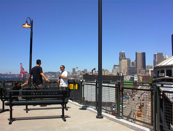 ferries chugging across Puget Sound in front of the Olympic mountains.