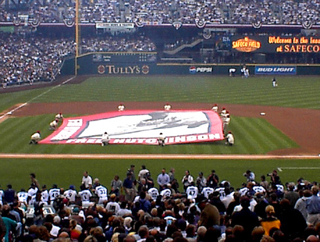the banner unfurled here. Hutchinson's grandson ran the bases, into the