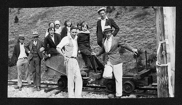 Second from left, Gordon Saxton; front in vest, Fritz Wissel standing on car in dark jacket, Clare Wissel.