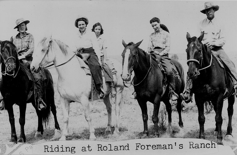 Betty, Marie & Kaye, Joan, and Roland Foreman, riding at Foreman ranch in Owyhee County, Idaho.