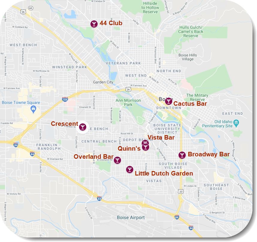 Boise's Oldest BarsDetermining the oldest bars in any area requires not just data and primary sources, but decisions on some fairly arbitrary criteria of what constitutes a single bar throughout the years. My data is far from comprehensive (and I'd love to get an email from anyone who can suggest additions), so this may remain a work-in-progress for some time. I have already benefited from much input from Boise historical groups, including several relatives of former owners. Let's start with the criteria I personally think make the most sense, with my best estimate of the years in which they were established: